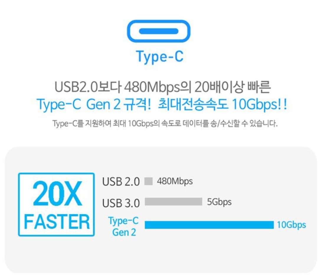 Type-C Gen 2규격은 USB 2.0 보다 20배, USB 3.0 보다 2배 빠르다고 강조하고 있다.
