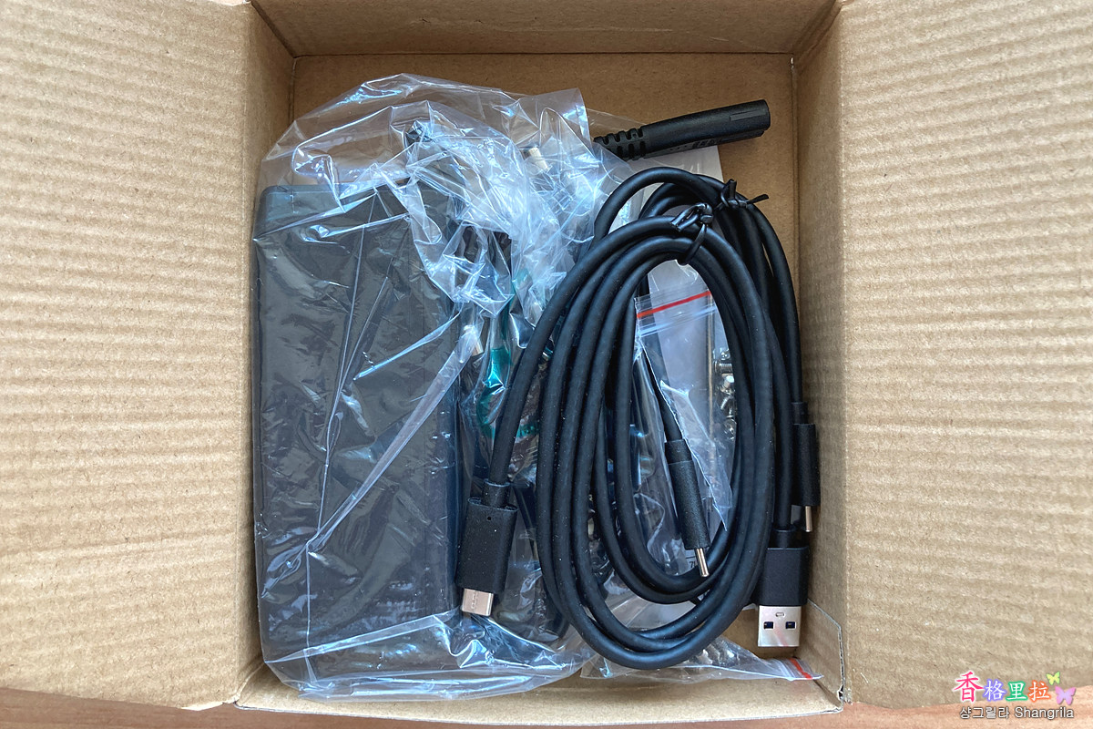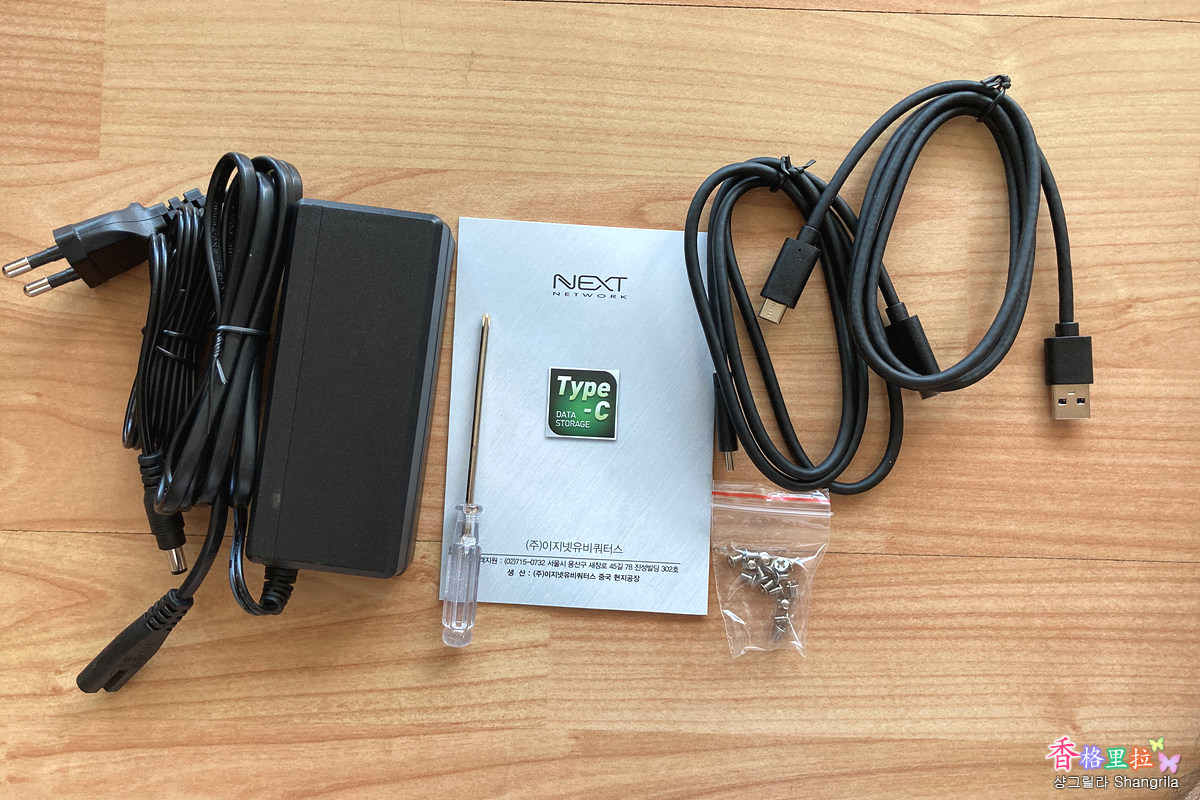전원 아답터(12V 5A), 설명서, 드라이브, 나사들 그리고 USB Type C Cable, USB Type C To USB 3.0A Cable 2가지를 제공한다.