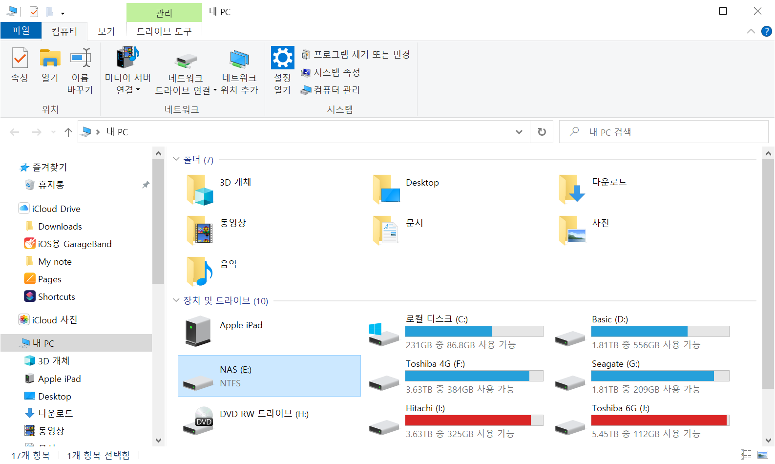 PC를 가동시키니 하드디스크 2개 중 1개는 문제없는데 이상하게 4TB 도시바 하드디스크만 NAS로만 표시되고 내용을 읽지 못한다.