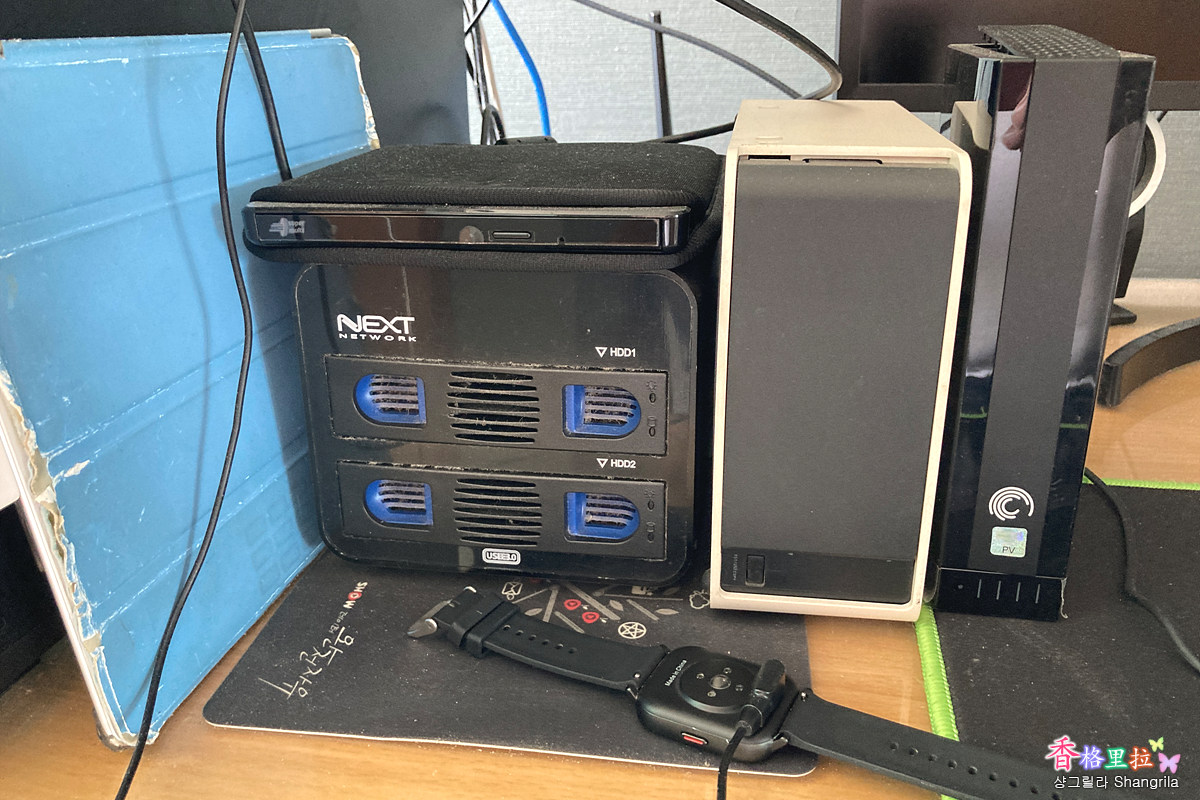 NEXT-702U3 2 Bay Raid Storage, IP Time NASII 그리고 외장하드가 책상 앞에 어지럽게 놓여있다.