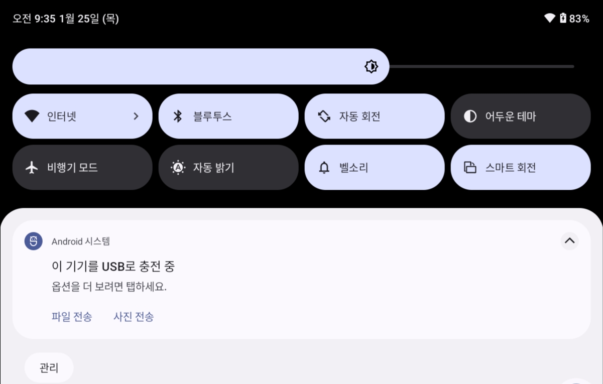 그리고 USB Cable을 연결했을 때 아무것도 안 보일 때는 충전으로만 작동하는 중이므로 화면을 위에서 아래로 쓸어내려 설정에서 파일 전송을 선택해주어야 한다.