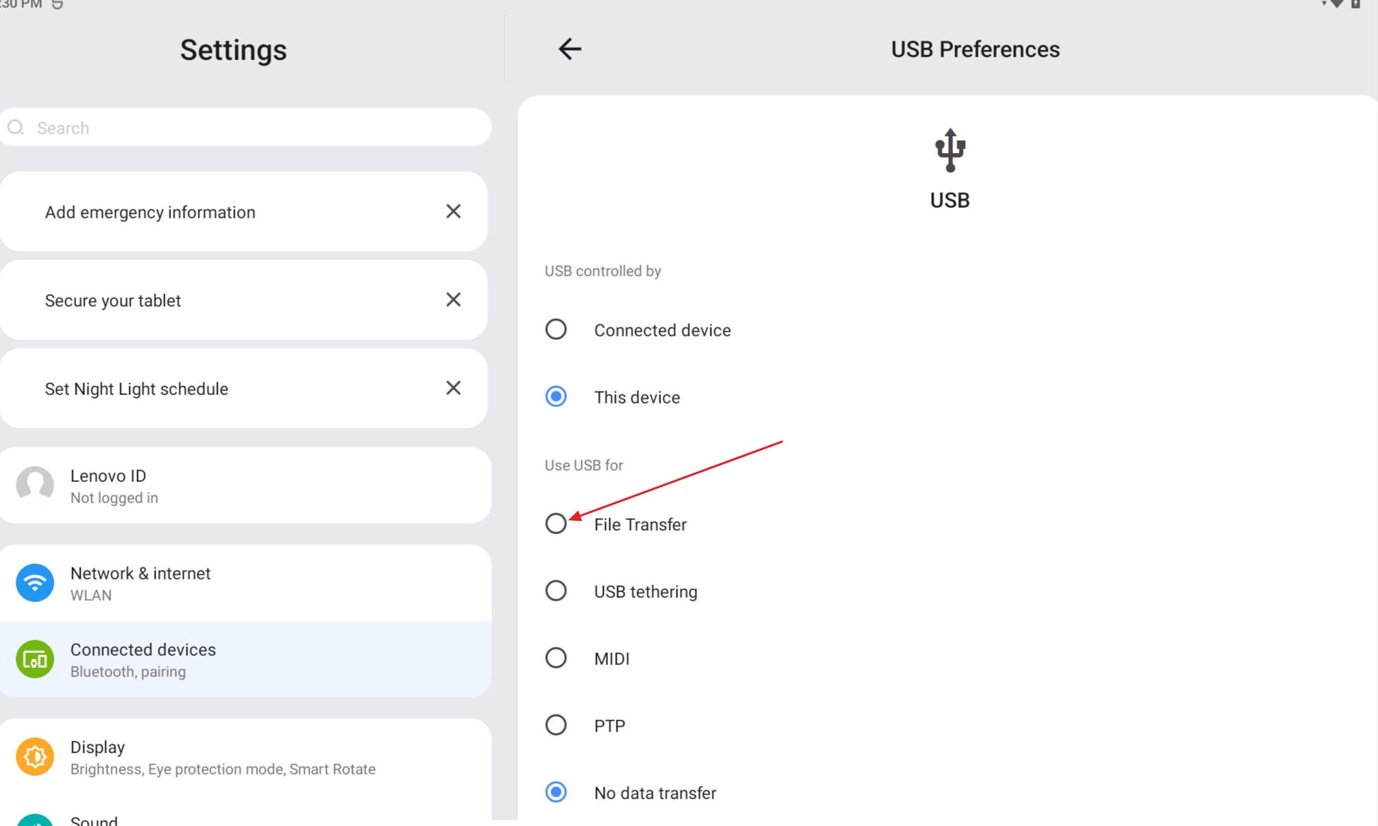 그런데 안드로이드 OS 기기인 레노버(Lenovo) P12 (Lenovo Tab M10 Plus 3rd Gen)를 PC와 USB Cable로 연결하니 아무것도 안 보인다.