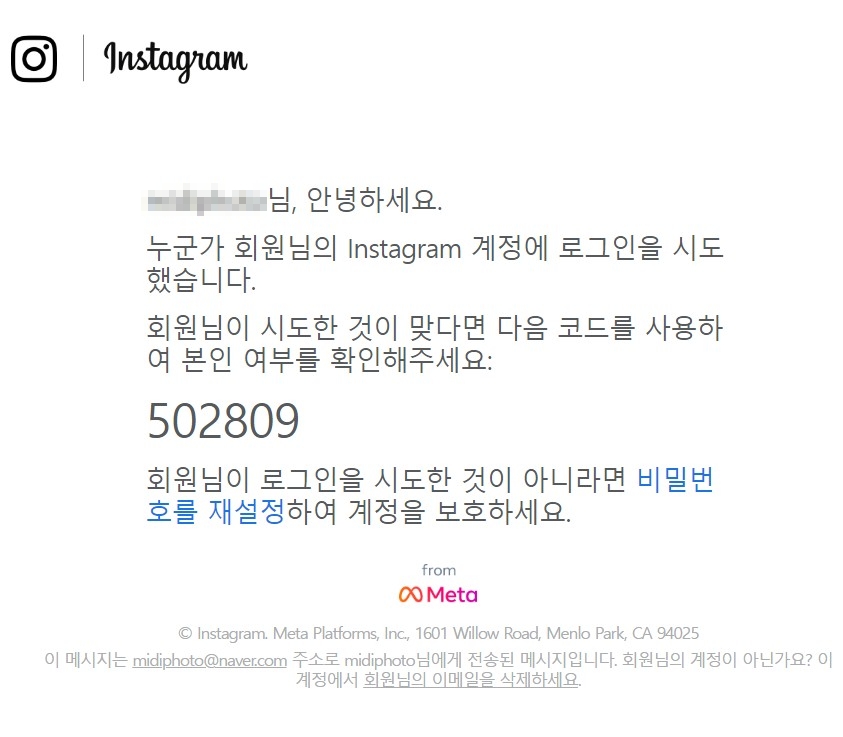 Instagram에서온 메일인데 지역은 알려주지 않고 누군가 로그인을 시도했다.