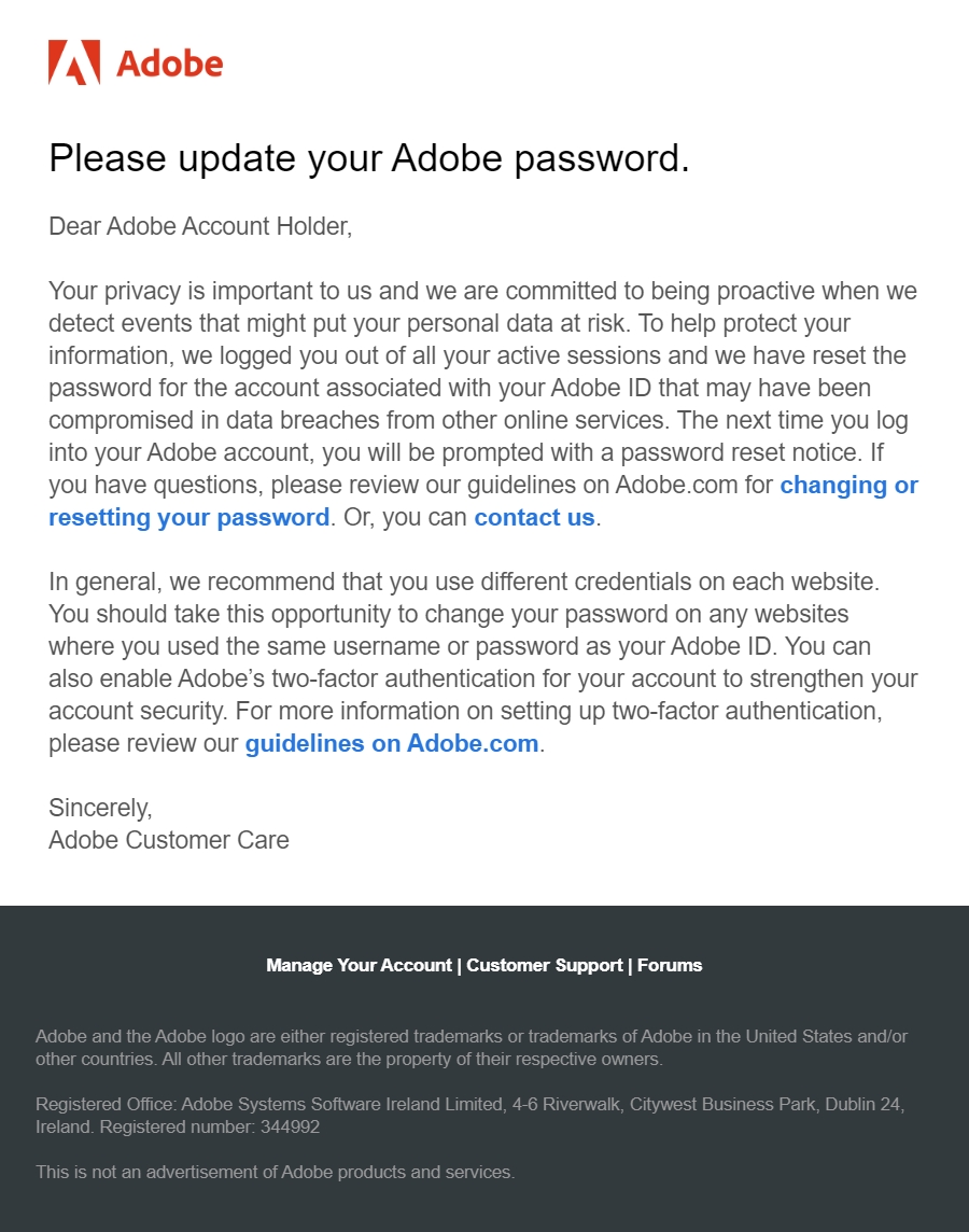 Adobe에서 온 메일도 역시 계정에 문제가 있으므로 password를 바꾸거나 resetting 하라는 메일이다.