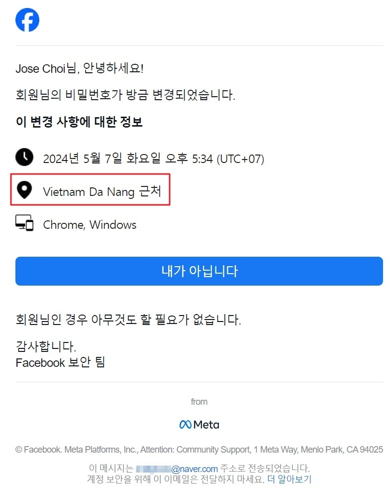Facebook에서 온 메일인데 베트남 다낭 근처에서 로그인 해서 내 비밀번호를 변경했다.
