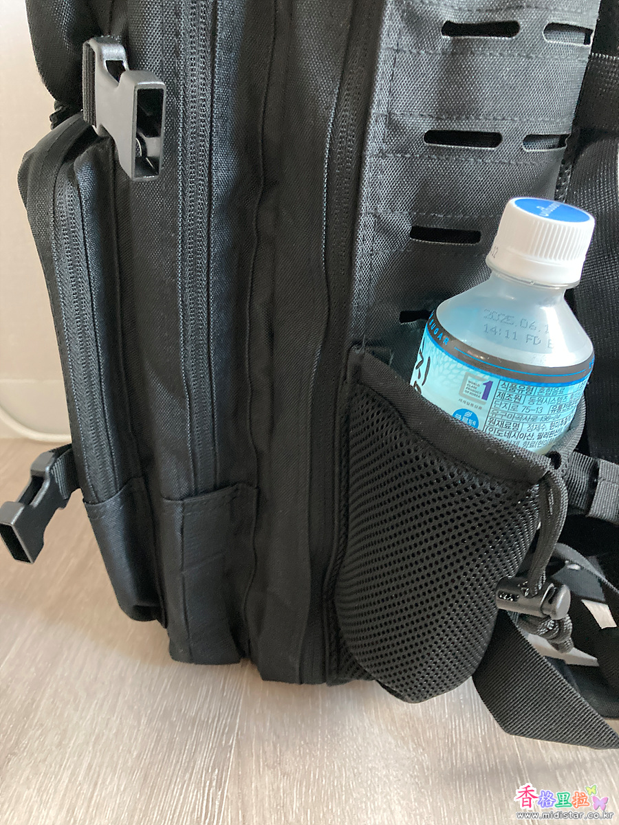 배낭 양옆에 물병을 넣을 수 있는 주머니가 있다. Ali에서 판매하는 배낭 중에 옆에 물병 주머니가 없는 제품도 있으므로 자세히 살펴보아야 한다.