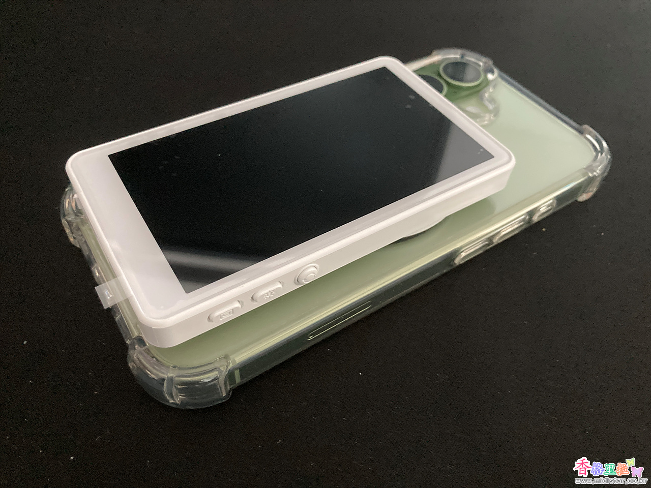 보통 셀카를 찍을 때 해상도가 높은 후면이 아니라 해상도가 낮은 전면 카메라를 사용하는데 이 제품은 해상도가 높은 후면 카메라로 셀카 사진을 찍을 수 있게 화면 미러링을 해주는 작은 모니터이다.